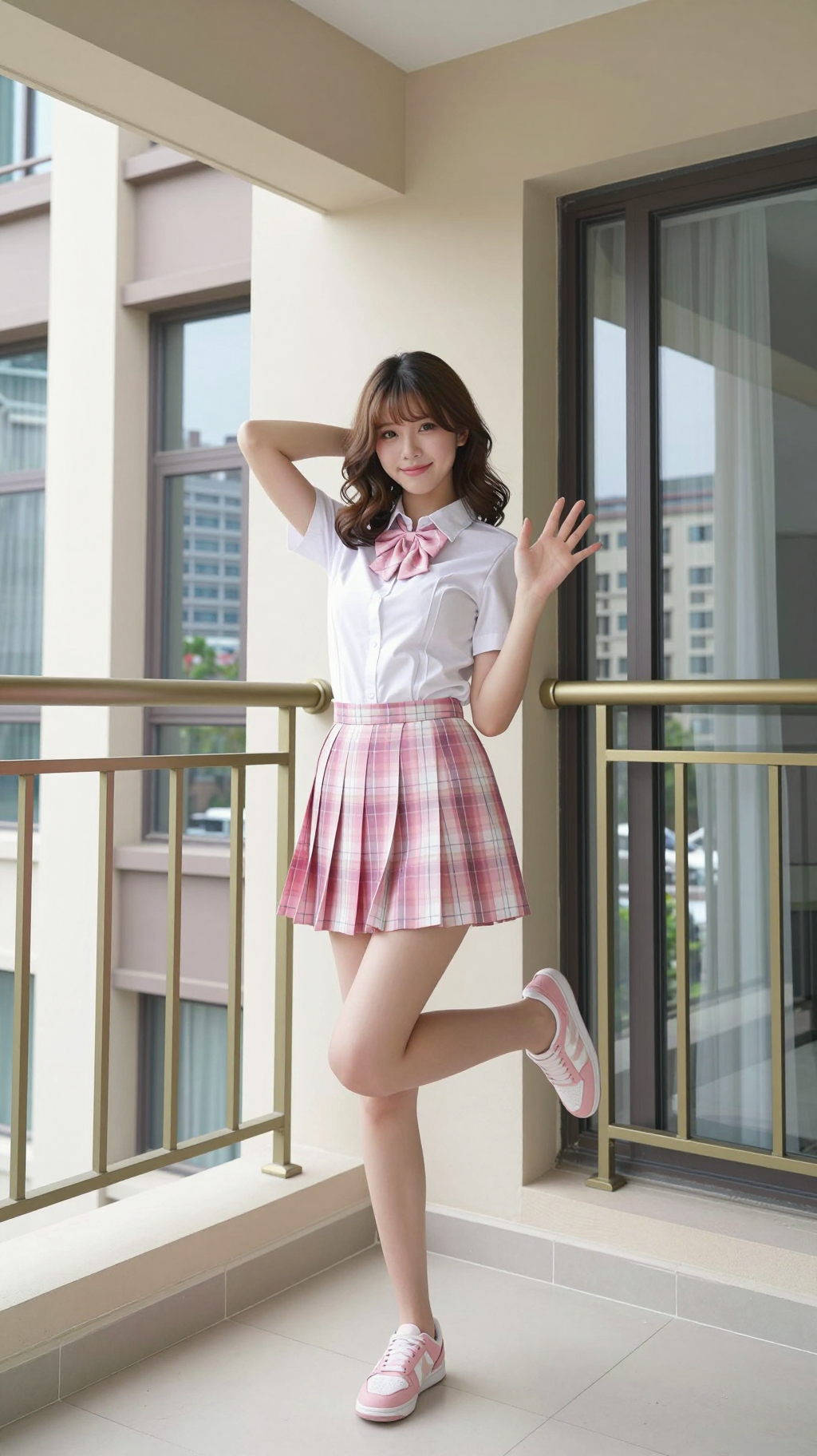 亞裔國風古風女性,稚嫩的臉,膚色極淺,18-20歲,棕色捲髮,棕色瞳,纖瘦,超巨大繃緊乳房,極長極長的小腿,微笑,穿著粉色百褶格子裙、學院風白襯衫、同裙子布料蝴蝶結領結,穿著粉色休閒鞋,姿勢:俏麗的站立,右手背後面,左手前傾揮手,一腳向後勾腳,正面視角取景,全身完整入鏡,背景:現代公寓陽台,淺米色建築柱與牆面搭配深色窗框,淺米色挑簷天花板,金屬陽台護欄,護欄外模糊的城市景觀(包含建築與車輛),明亮自然日光,乾淨極簡美學,陽台眺望城市視角。,柔和柔光,8K超高清,比例9:16,Z-image